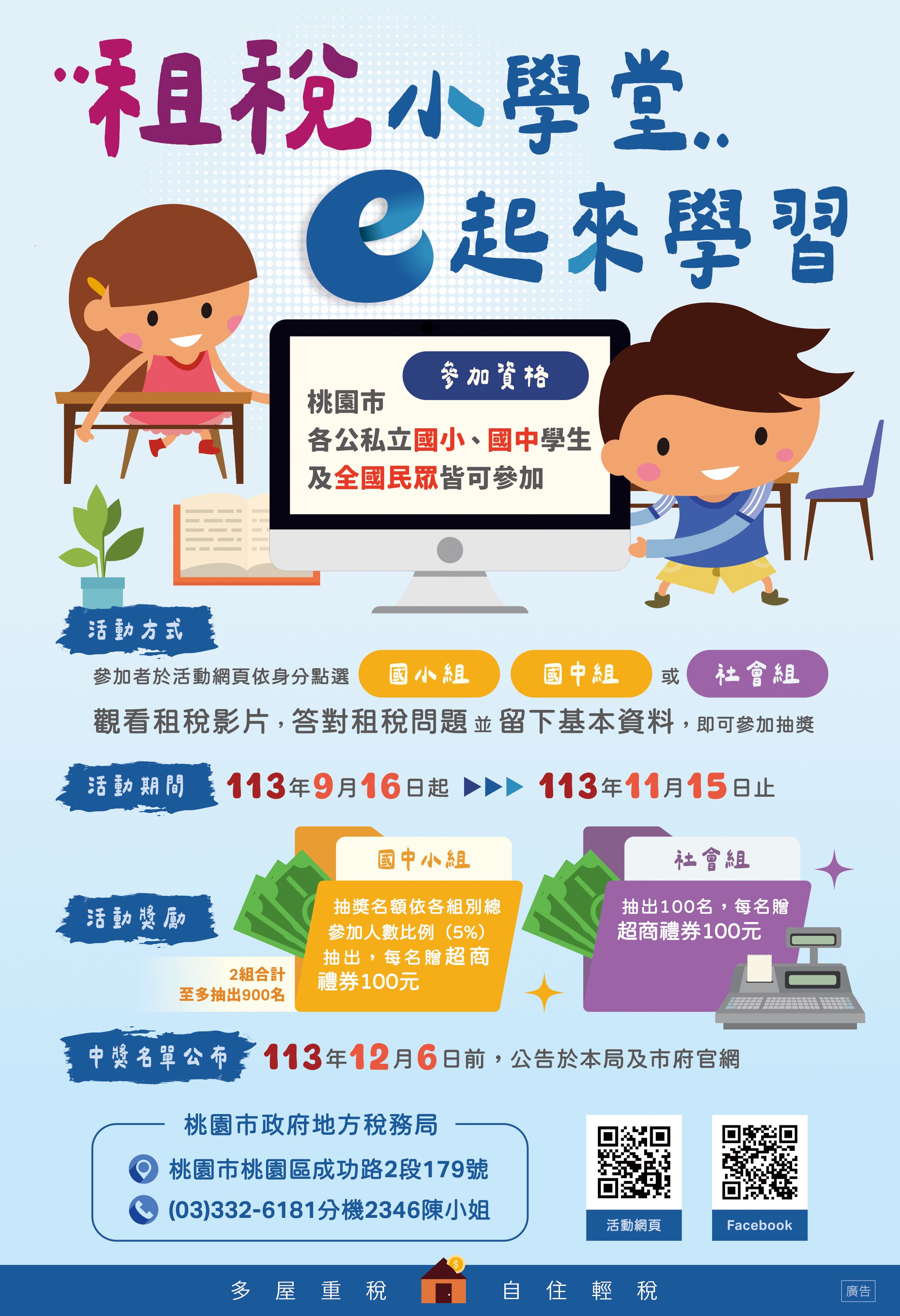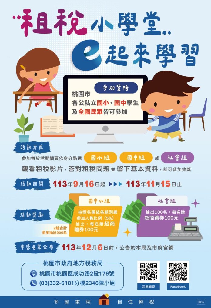 桃園市政府地方稅務局為加深學生及民眾租稅常識,將舉辦「租稅小學堂.E起來學習」看影片學租稅網路抽獎活動,活動期間自113年9月16日起至113年11月15日止,歡迎大家踴躍參加,一起成為租稅達人!