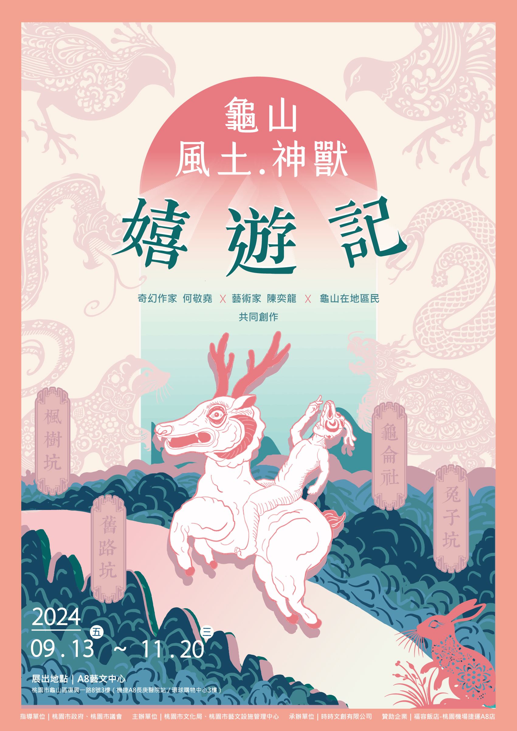「翻開傳說故事的篇章,腳踩龜山地圖,同風土神獸嬉遊龜山地景,浸浴在風土神獸的庇佑下」!今年度 A8 藝文中心邀請龜山在地居民一同與風土神獸嬉遊,於開幕茶會(9月14日,星期六)邀請奇幻作家何敬堯,藝術創作者陳奕龍,以及 40 位共創工作坊的學員們在現場分享他們的創作理念。