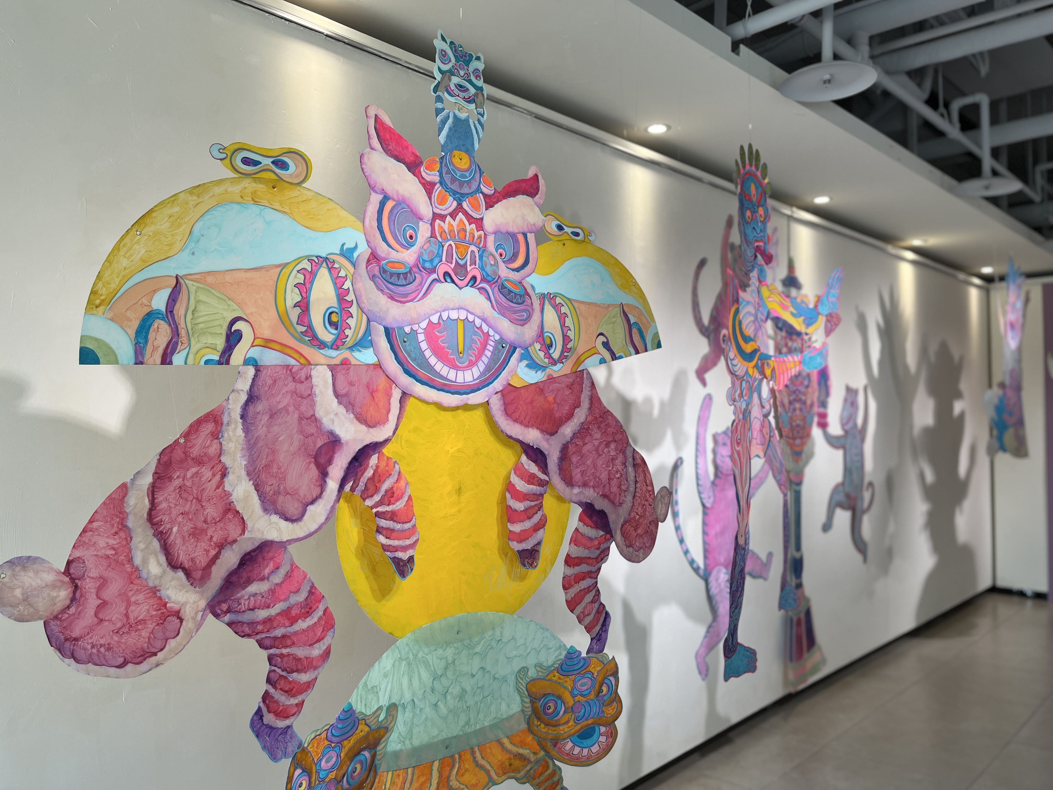 新銳藝術家陳奕龍考究古籍,一筆筆手繪出的龜山地圖,與參與共創藝術工作坊的民眾創意發想的風土神獸皮影作品環繞展場,亦展出〈巫覡似神集〉系列作品,讓觀展者彷彿置身龜山的中心,受到風土神獸的滿滿的保佑與守護!