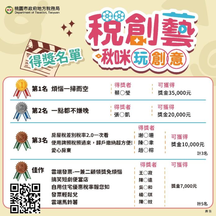 桃園市政府地方稅務局舉辦「113年『稅創藝 啾咪玩創意』租稅短片創作競賽」,參賽者將租稅主題以創意且生動的方式,透過戲劇演出或精緻手繪方式呈現,經評審委員熱烈討論,得獎名單終於出爐!