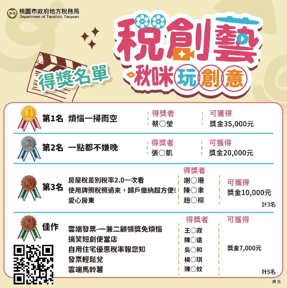 第三名:「房屋稅差別稅率2.0一次看」,作者謝○珊;「使用牌照稅照過來,歸戶繳納超方便!」,作者陳○聿;「愛心房東」,作者趙○榕。以上3部作品作者可獲得獎金1萬元及獎狀。