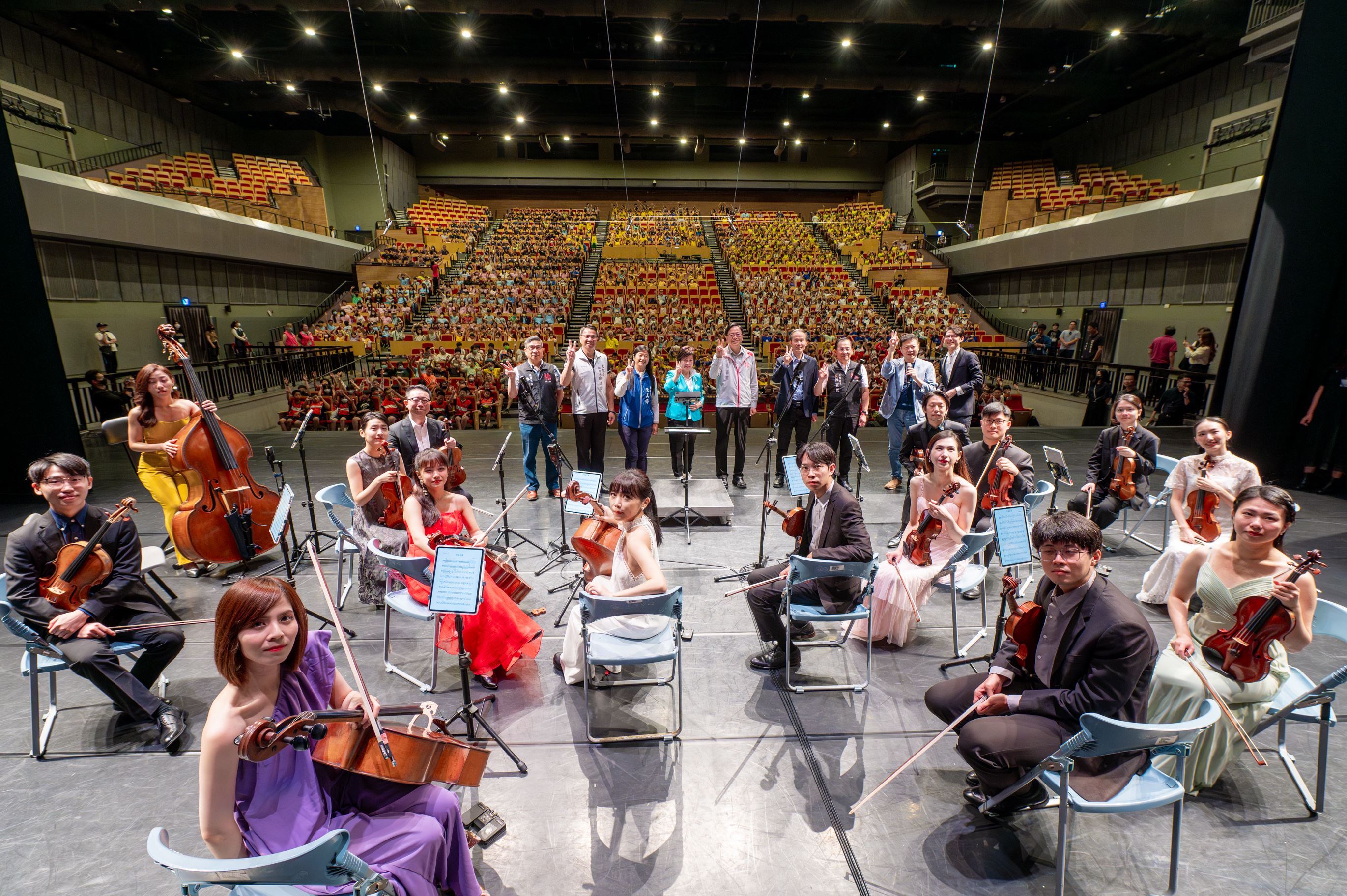 張市長提到,灣聲樂團臺灣行腳第12季音樂會於9月23日至9月25日期間,共有9場演出,除了6場白天專場,另有3場夜間演出開放市民參與,感謝世外桃源文教公益基金會補助部分交通費,讓桃園市50多所學校的學生能夠進場聆聽古典音樂。張市長也勉勵學生們在音樂會中細心聆聽,透過此次活動對音樂產生更深的興趣,未來有機會可進一步學習各類樂器,甚至參與演出。