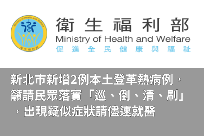 衛生福利新北市新增2例本土登革熱病例,籲請民眾落實「巡、倒、清、刷」,出現疑似症狀請儘速就醫