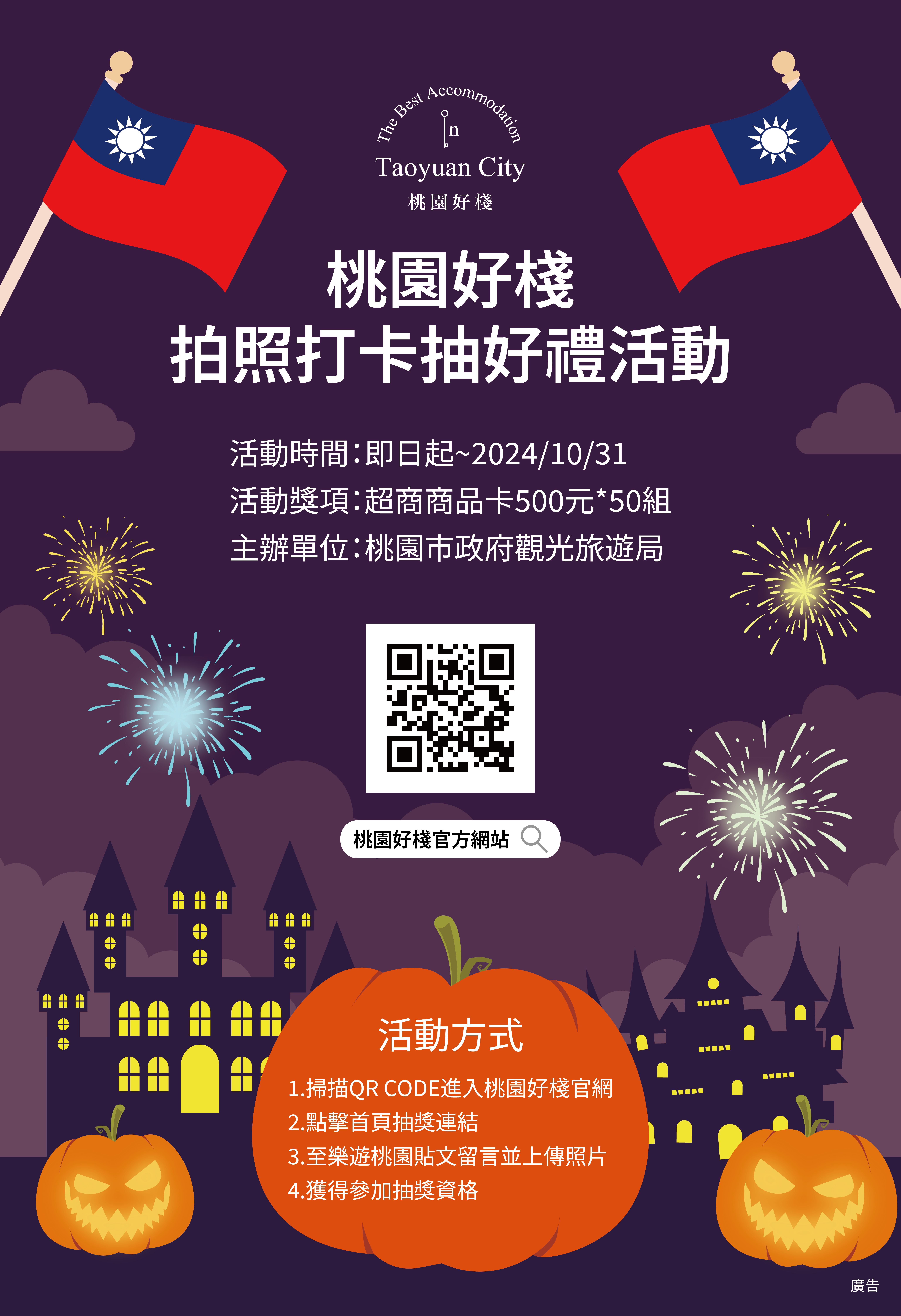 為慶祝國慶月,桃園市政府觀光旅遊局與桃園好棧旅宿業者共同合作,推出「國慶萬聖桃園好好玩~桃園好棧拍照打卡活動」,多家旅宿祭出「旅宿同慶優惠」,十月來桃園旅遊,打卡抽好禮,暢享旅宿超值優惠!