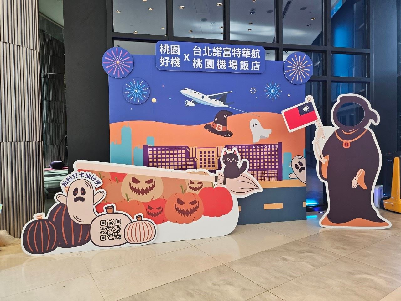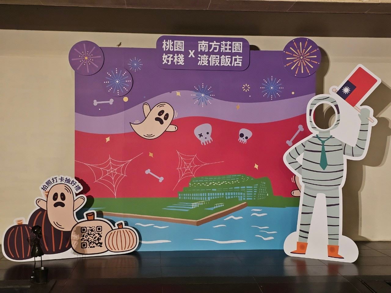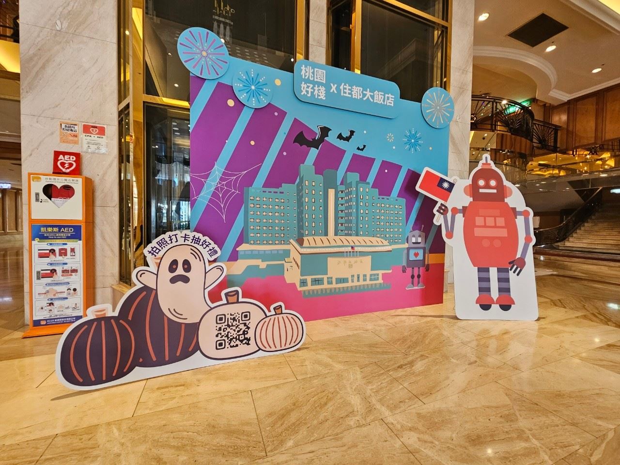 觀光旅遊局周柏吟局長表示,這次觀光旅遊局製作了10款限定拍照打卡牆,結合萬聖節元素及歡慶國慶煙火意象,搭配活潑的拍照動作及打卡分享,跟好友一起歡慶十月國慶日與萬聖節。這次10款限定拍照打卡牆放置於名人堂花園大飯店、和逸飯店桃園館、福容大飯店桃園、桃園喜來登酒店、尊爵天際大飯店、南方莊園渡假飯店、尊爵大飯店、住都大飯店、福容大飯店桃園機場捷運A8、台北諾富特華航桃園機場飯店,邀請大家趕快來桃園蒐集。