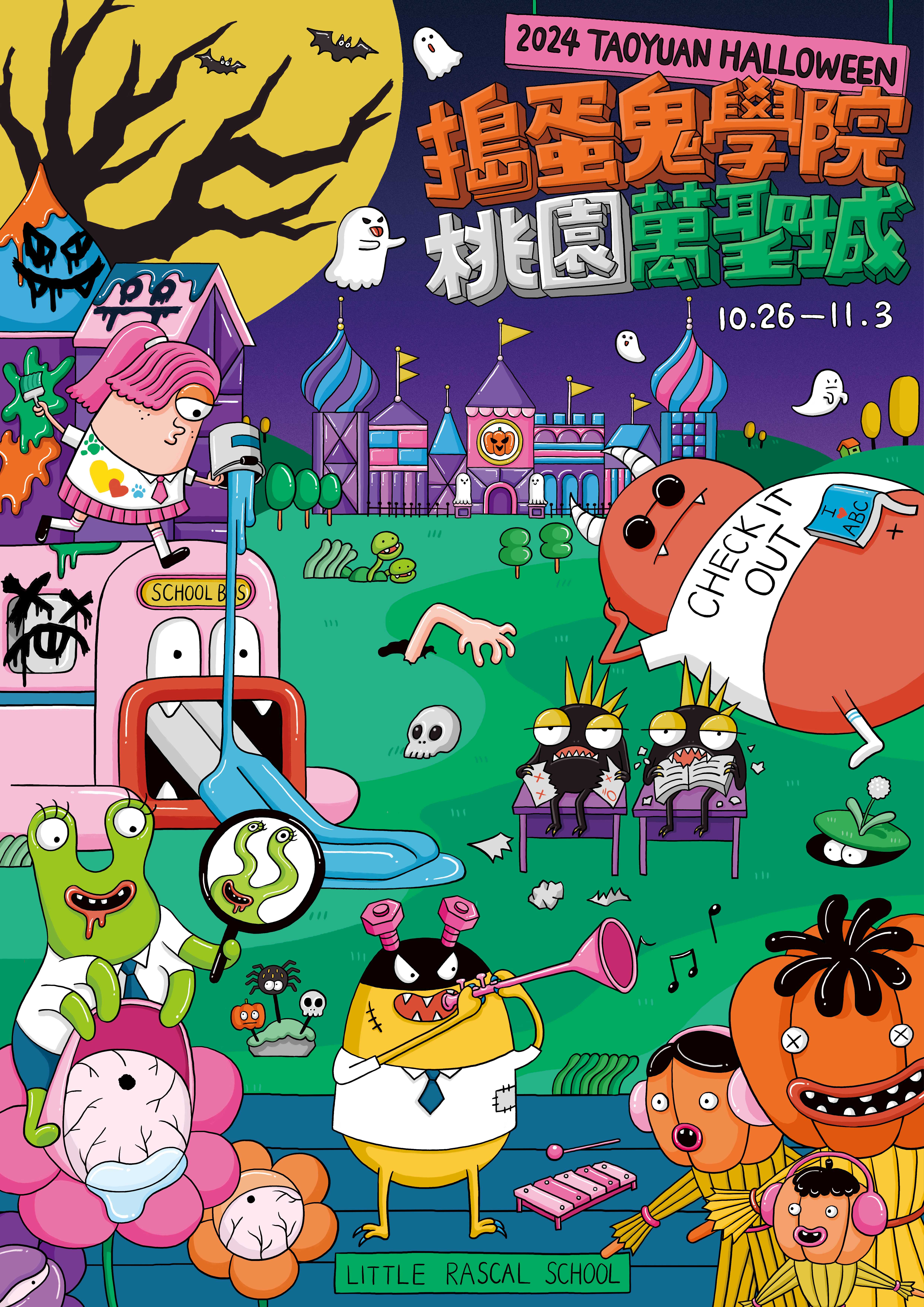 2024年桃園萬聖城「搗蛋鬼學院」招生中,萬聖節不GO搗蛋可不行!是時候喚起調皮搗蛋的本性,第5屆「桃園萬聖城」即將在10月26日於桃園藝文廣場及藝文綠園道熱鬧開城,為期9天的萬聖系列活動,主打可愛又恐怖的學院風設計裝置藝術,串聯整個綠園道,帶來四大學院及搗蛋鬼校車,再搭配有全台最美圖書館之稱的桃園市立圖書館總館,以及剛開幕的「桃知道GELEVEN PLAZA」,也將在總館外牆佈置連動,讓萬聖節氛圍感再升級;並以親子及青年族群為主要對象推出系列活動,包含踩街遊行、開城演唱會、變裝競賽、電音派對、公益彩券活動、親子互動及系列主題之夜等豐富活動,以大型裝置作品、精彩舞台表演、主題市集與萬聖氛圍營造,每天都充滿不同驚喜。