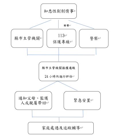 ●縣市主管機關於第一時間評估兒少照顧者保護照顧功能以及兒少之安全,針對不適宜交付之照顧者,向法院聲請安置,並委託社福機構、寄養家庭、中途學校等處所協助照顧。