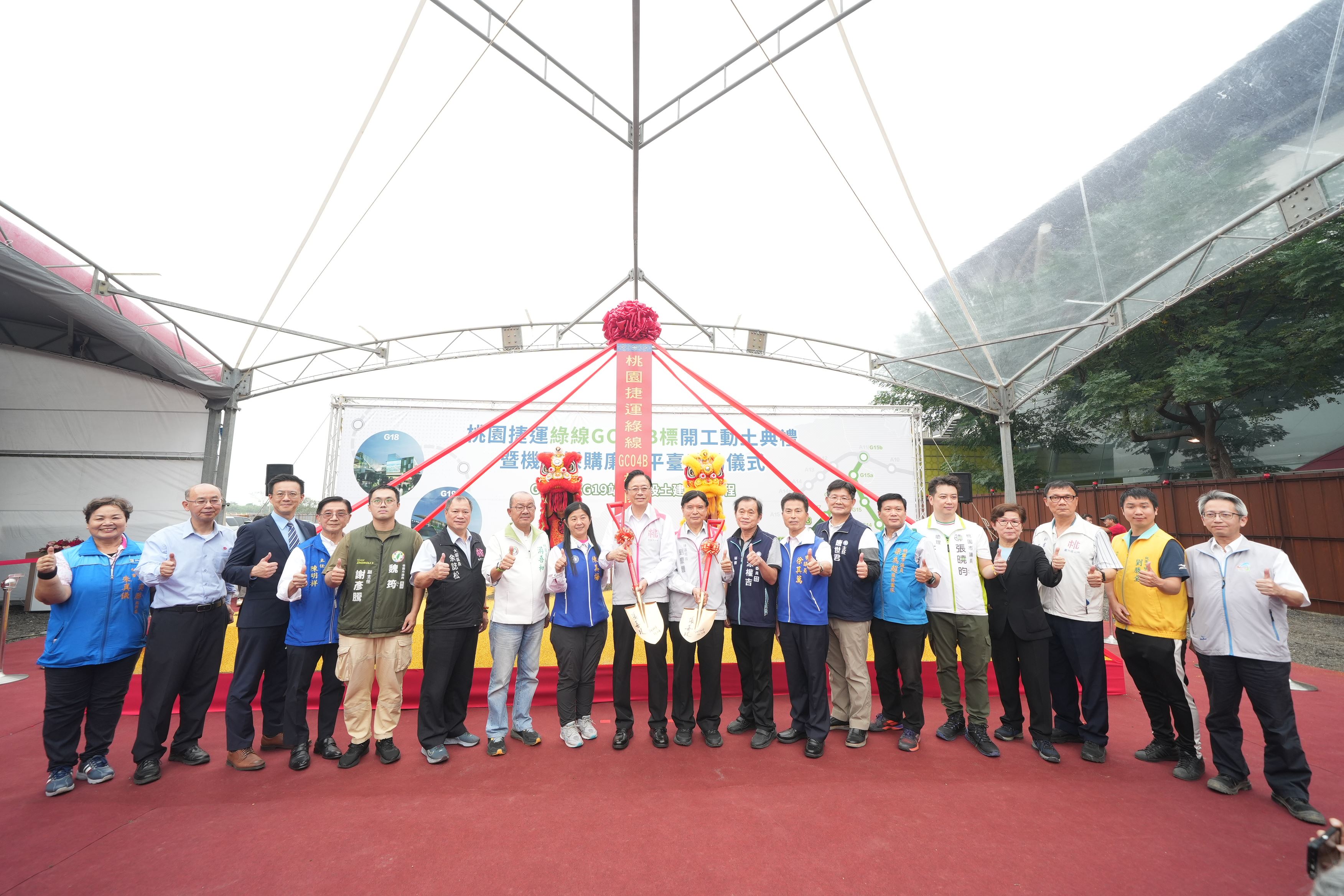 桃園捷運綠線GC04B標高架段土建統包工程今(14)日於航空城開發範圍的車專區開工,由桃園市長張善政親自主持,路段全長1.3公里,共設G18及G19兩座高架車站,工程將橫跨國道二號高速公路,與機場捷運線A16橫山站銜接,為「三心六線」路網中的關鍵一環,也代表著捷運綠線建設邁入全新階段。