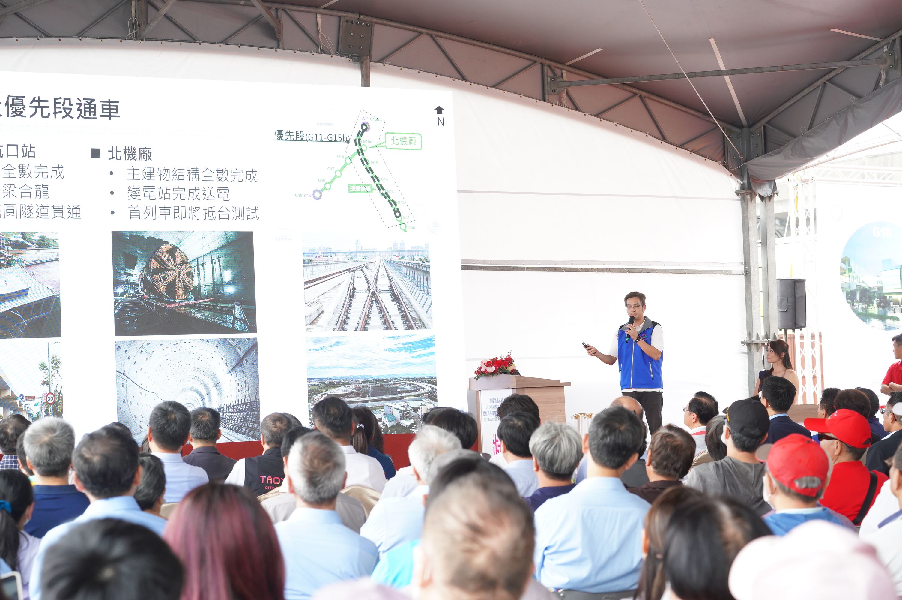 捷運工程局劉慶豐局長表示,捷運綠線自107年起分階段推動施工,克服了高架及地下隧道等許多工程挑戰,至今已取得多項重大進展,包括高架段全數合龍、北段地下段傳統圓隧道全數貫通,以及北機廠主結構上梁與送電完成,預計今年底首列車即將來台,明年將開始上軌道測試,施工團隊正全力邁向115年通車至機場捷運坑口站之目標。