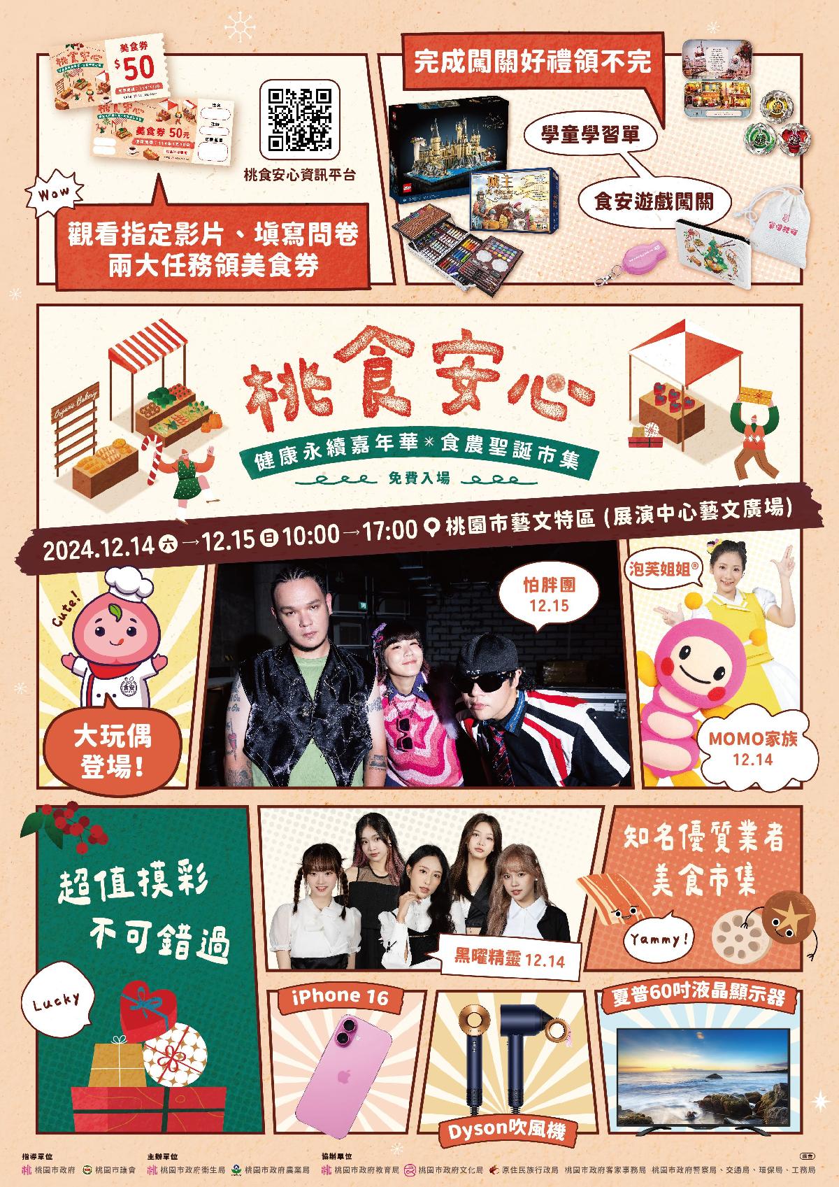 好康來了2024年12月14、15日,桃園市政府衛生局聯合農業局共同舉辦「桃食安心 健康永續嘉年華暨食農聖誕市集」!讓我們相聚在桃園市藝文特區展演廣場,展開一場美食與知識的饗宴,一起感受年末的歡樂氛圍!