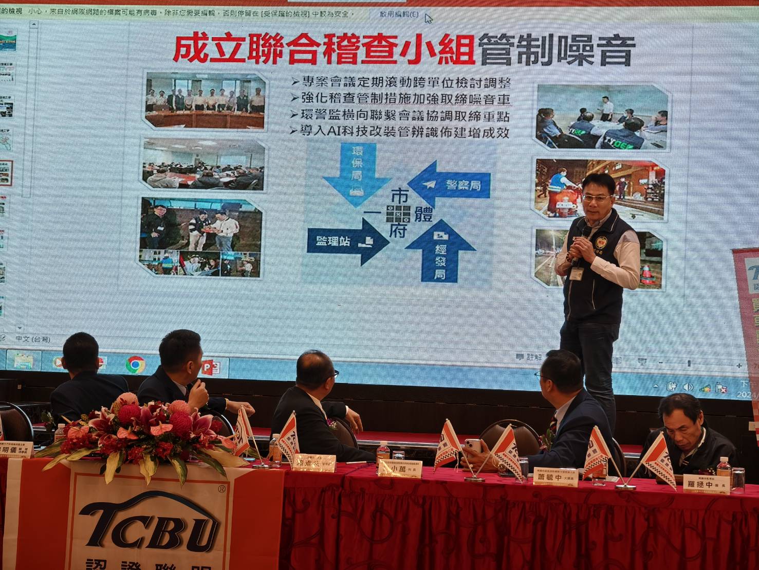 為守護市民安寧,桃園市環保局持續加強各項管制措施打擊噪音車、追蹤輔導改裝車足跡和查緝取締及輔導改裝車業等措施,並於11月26日接受桃園市汽車商業公會理事長徐立昇邀請,由該局噪音管制及環境監測科吳小萬科長與政風室李紹凱主任至會員大會進行管制噪音與廉政宣導,會中也與公會成員一同宣示還「靜」於民。