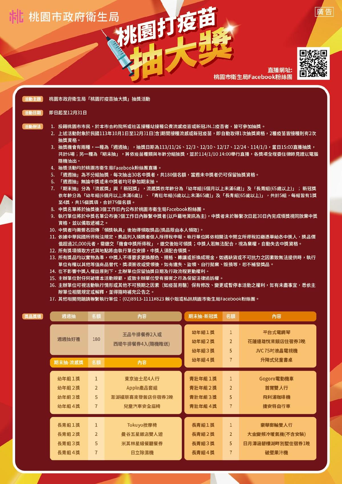 凡設籍桃園市的市民,只要在113年10月1日至12月31日期間,於本市合約醫療院所或社區接種站完成公費流感疫苗或新冠JN.1疫苗接種,即可參加抽獎!每接種一針,就能獲得一次抽獎機會,打兩針則有兩次機會,疫苗數量有限,越早接種中獎機會越多!
