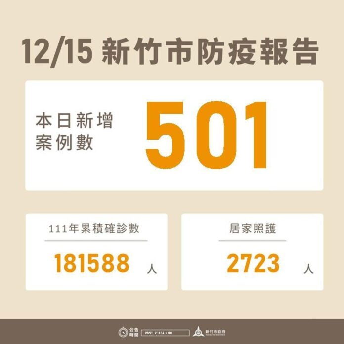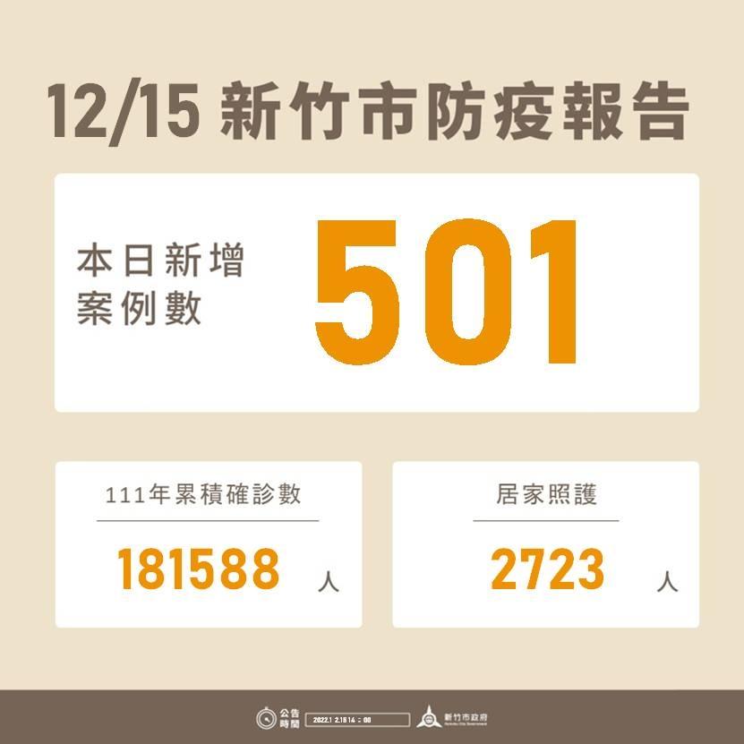 新竹市今(15)日新增501例確診個案,今(111)年以來累積181,588例,居家照護者為2,723人。
