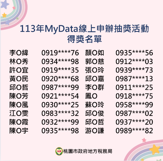 桃園市政府地方稅務局113年「MyData線上申辦抽獎活動」已於113年11月30日圓滿結束,並於113年12月6日以電腦隨機抽出20名幸運得獎者,每位可獲得200元即享券,得獎名單如下圖。