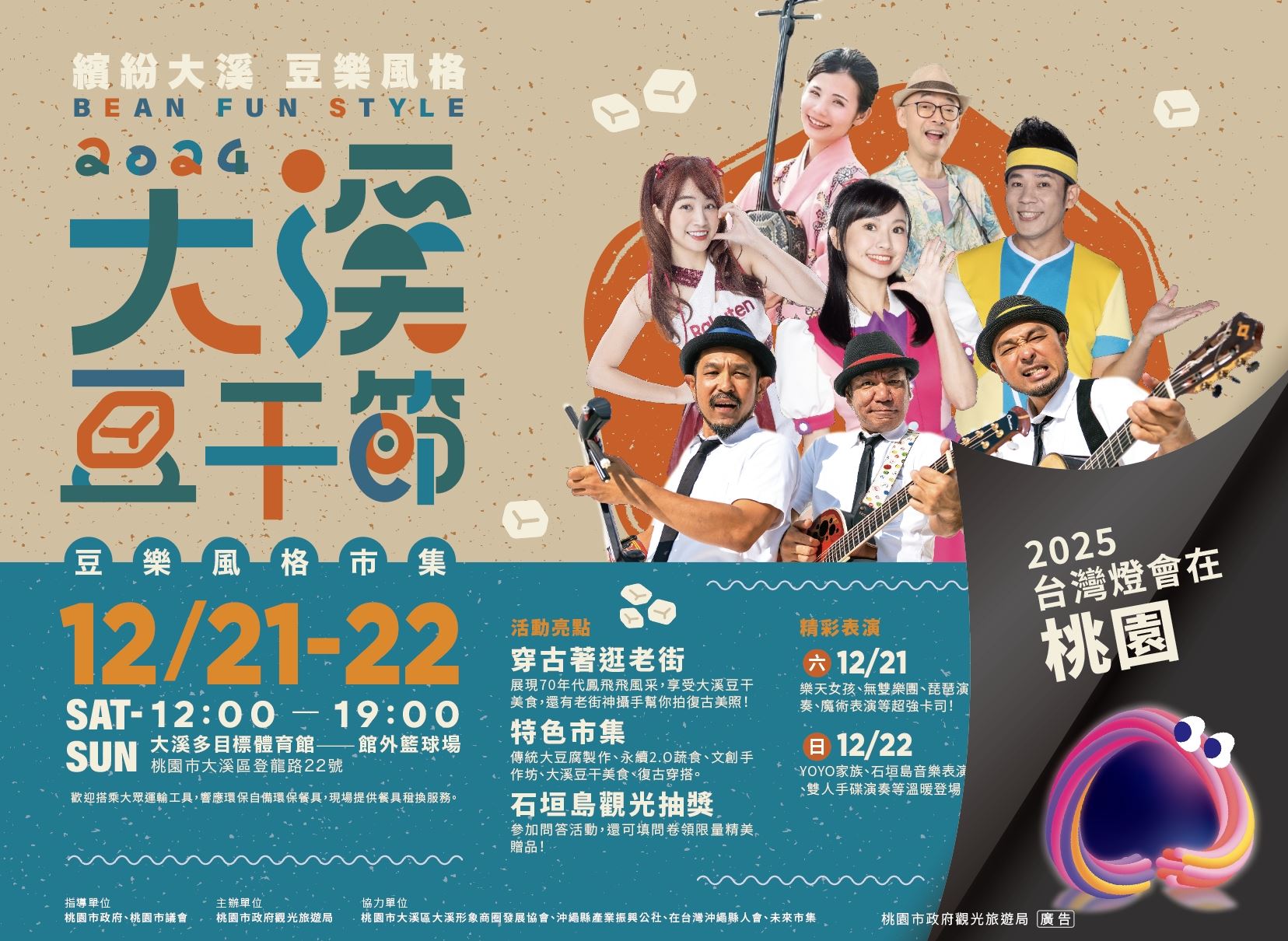 一年一度的大溪豆干節將於12月21日至22日在大溪多目標體育館旁廣場繽紛登場,桃園市政府觀光旅遊局今(103)年度以「BEAN FUN STYLE 繽紛大溪,豆樂風格」為主題,藉由黃豆的英文「BEAN」為靈感,融入諧音「been fun(繽紛)」,傳遞出趣味活力的全新品牌形象。活動安排上融合傳統、創新與國際視野等元素,打造結合地方特色與創新理念的「豆樂風格市集」、致敬經典的「鳳飛飛ERA復古扮裝派對」、大溪探店雙軌集章活動以及推動蔬食友善標章第二波徵選活動,另外還邀請來自日本沖繩石垣島代表團參與交流,帶來限量沖繩ゆし豆腐料理,深化雙方文化連結,並廣邀內外旅客一同體驗大溪的文化底蘊與創新活力。