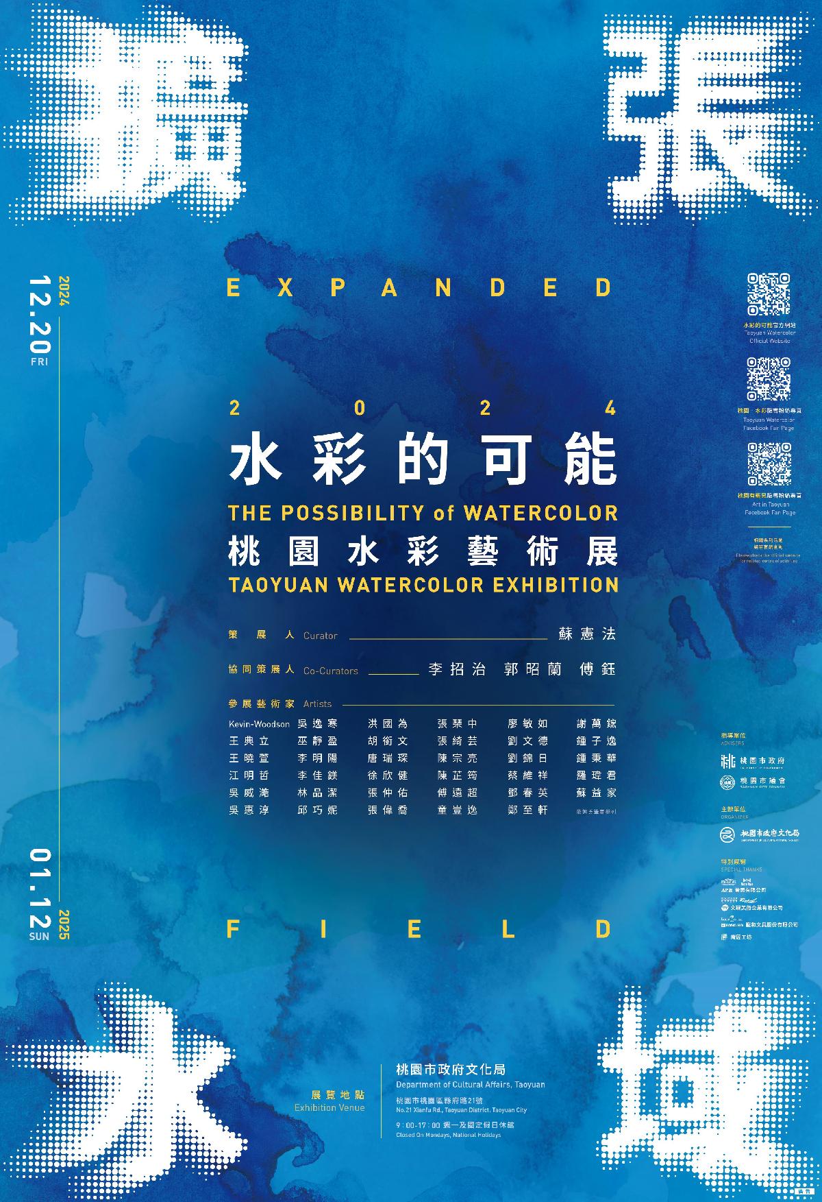 桃園市政府文化局長年投注資源於水彩藝術的推廣與發展,以雙年展形式,每年交錯舉辦「水彩的可能」水彩藝術展及「活水」國際水彩展,使桃園成為水彩藝術重鎮。2024「水彩的可能」以「擴張水域」為題,由國立臺灣師範大學美術系名譽教授、現任國家文化藝術基金會董事擔任蘇憲法策展人,另李招治、郭昭蘭、傅鈺擔任協同策展人,自12月20日起至2025年1月12日,邀約來自國內35位藝術家、114件作品,在桃園市政府文化局全館隆重舉行,歡迎市民朋友共襄盛舉。