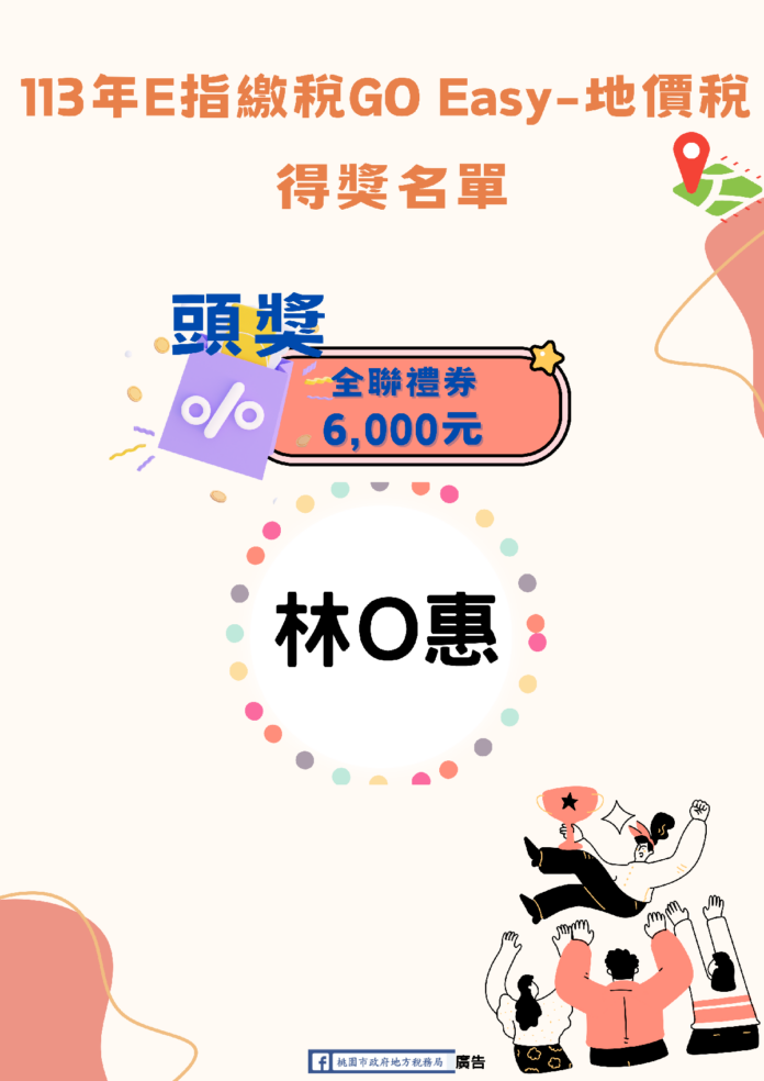 桃園市政府地方稅務局為鼓勵民眾體驗E指繳稅的便利性,於地價稅開徵期間(11/1~11/30)舉辦「E指繳稅GO Easy-地價稅」抽獎活動,只要至地方稅網路申報作業網站進行線上查繳或以台灣Pay、電子支付帳戶繳納桃園市地價稅,即可獲得抽獎機會。獎項有全聯禮券6,000元1名及便利商店100元禮券200名,得獎名單如附件。