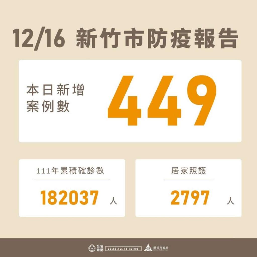 新竹市今(16)日新增449例確診個案,今(111)年以來累積182,037例,居家照護者為2,797人。