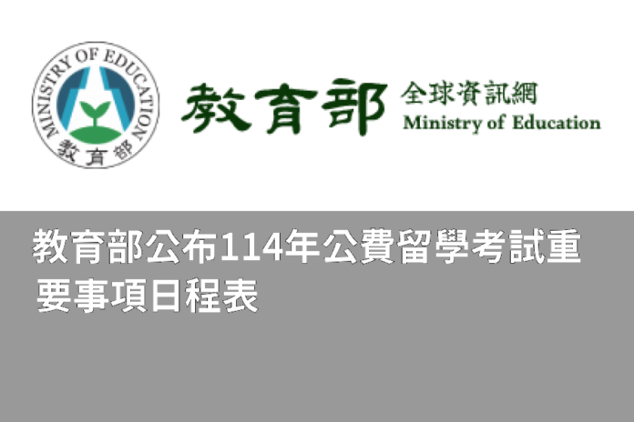 114年公費留學考試預定於114年3月底前公告一般公費留學及赴新南向國家公費留學學門、研究領域、留學國家、應考專門科目及預定錄取名額表,簡章將於本年6月底至7月中旬間公告,並自7月15日起至7月29日止開放網路報名。