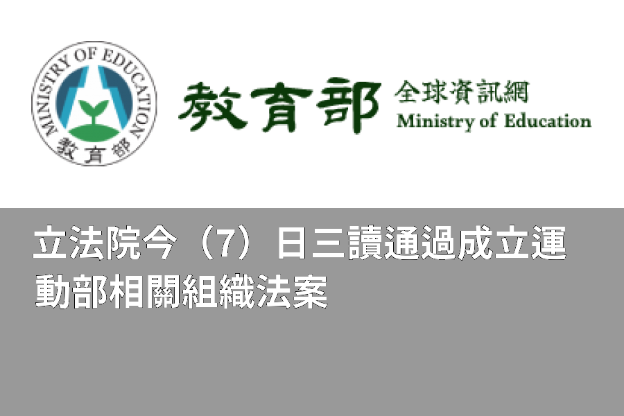 立法院院會今(7)日三讀通過成立「運動部」有關的7案組織法案,制定「運動部組織法」、「運動部全民運動署組織法」及「國家運動產業發展中心設置條例」3案,以及修正「行政院組織法」、「教育部組織法」、「國家運動訓練中心設置條例」及「國家運動科學中心設置條例」4案。成立「運動部」獲立法院朝野支持,教育部體育署鄭世忠署長前往立法院議場感謝立委們在本會期推動組織法三讀通過,期盼能於今(114)年掛牌運作,讓臺灣運動發展走向下一個嶄新的階段。