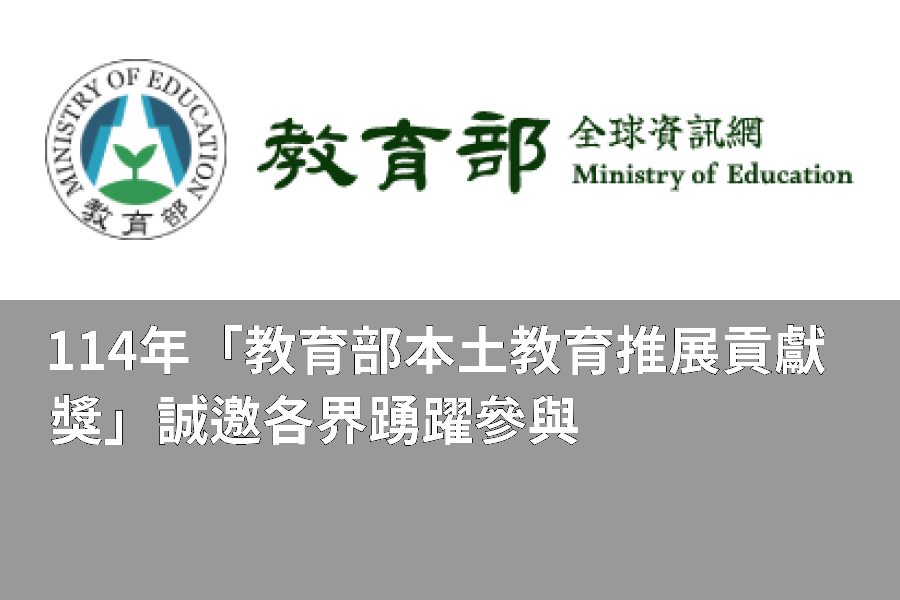 為表彰對推展本土教育具顯著貢獻的個人和團體,教育部國教署辦理114年「本土教育推展貢獻獎」,請各機關(構)及團體,於114年3月31日前向教育部或地方政府申請及推薦,協辦團隊國立臺南大學本土語文教育資源中心彙整相關資料後,將由教育部邀集具公正性之專家學者進行評選,預計選出個人獎及團體獎共10名,歡迎各界踴躍投稿參與。