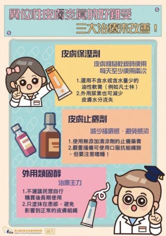三、外用類固醇:外用類固醇可說是異位性皮膚炎的治療主力,但長期使用外用類固醇會造成皮膚變薄、變色等問題,且類固醇的強度與劑型不同,適用的皮膚部位也不一樣,民眾使用時應遵照醫療專業人員的指示,切勿自行用藥,亦勿自行增減頻率及塗藥範圍。