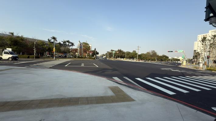 此外,工務局亦於增設附加左轉車道路口進行行人環境優化,包含街角擴大,行穿線退縮及拉直、路口導盲設施、增設放大型行人燈箱等,以利行人通過路口更加安全。