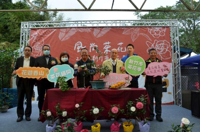 2022「風尚茶花」!新竹市茶花季產業文化活動今(17)日,在綿綿細雨的寒風中,於茶花產銷班(新竹市大湖路167巷63號)絢麗登場,在「風尚茶花」開幕活動中由產發處長許智堡、新竹市農會理事長陳勝賢、茶花產銷班長邱穩正及與會貴賓,共同進行茶花風尚花藝設計儀式,象徵迎新送舊花開富貴迎新年。