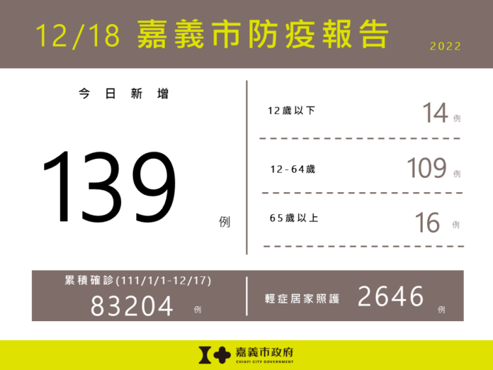 中央流行疫情指揮中心今(12/18)日公布嘉義市新增139例確診個案,包含12歲以下14例,12-64歲109例,65歲以上16例。嘉義市目前輕症居家照護人數2646人。111/1/1截至111/12/17嘉義市累計確診嚴重特殊傳染性肺炎本土病例數為83204人。衛生局提醒,請大家儘速接種疫苗,並持續落實勤洗手、咳嗽禮節及佩戴口罩等防疫措施,避免出入人多擁擠的場所及高感染傳播風險場域,如出現疑似症狀,儘速快篩就醫和遵從醫囑及早服藥,降低重症及死亡風險;並請養成規律運動、均衡飲食、充足睡眠、壓力調適、不吸菸等健康習慣,提升免疫力,守護自己與家人的健康。