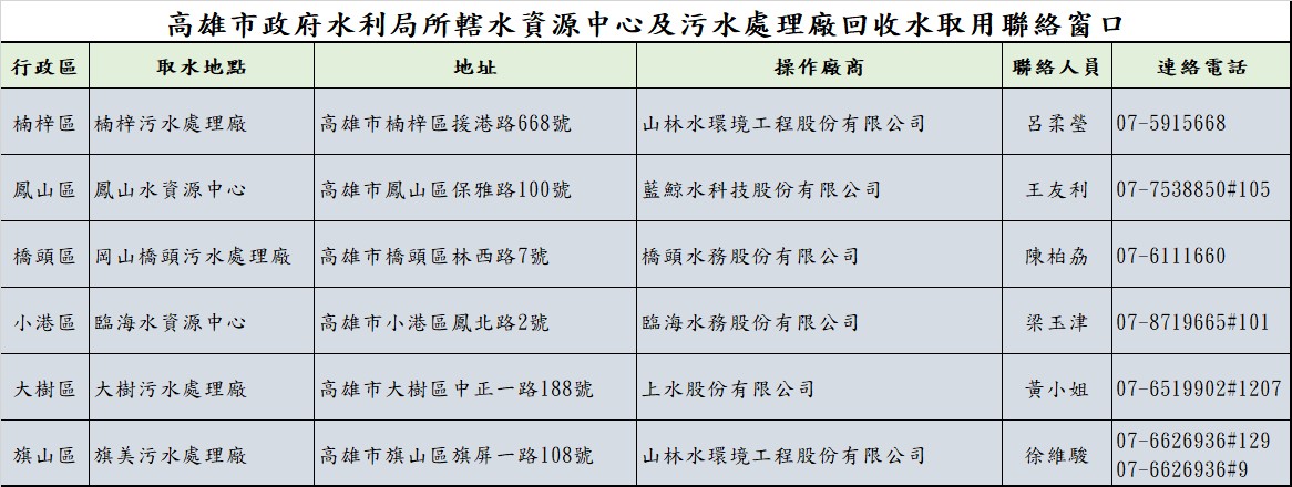 水利局表示,所轄鳳山及臨海等2處水資源中心,楠梓、岡橋、大樹及旗美等4處污水處理廠每日共可提供約1.8萬噸回收水作為非人體接觸,如沖洗街道、工地防止揚塵、澆灌等次級使用,水利局提供取水地點及連絡窗口等資訊,請民眾及需用單位直接連絡,踴躍取用。