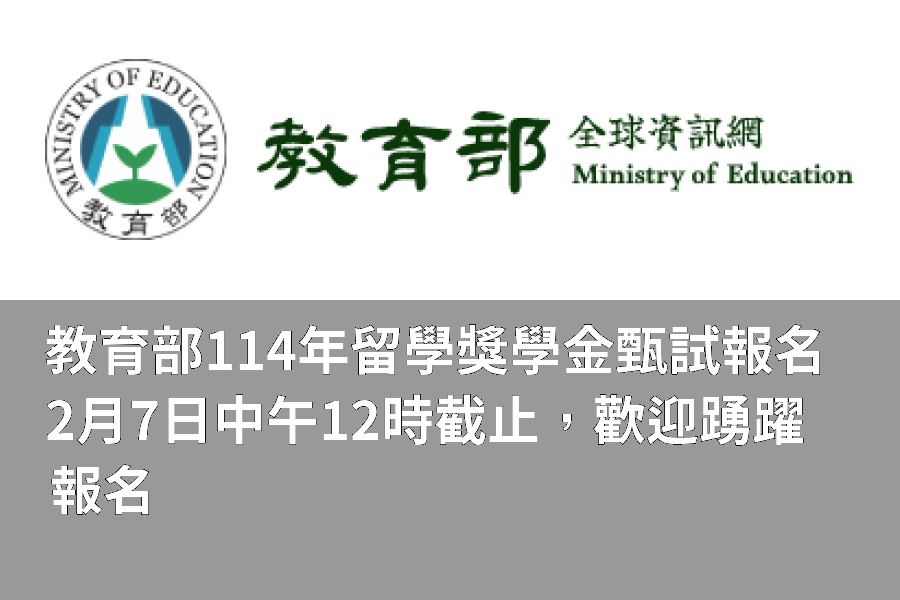 教育部114年留學獎學金甄試報名114年2月7日中午12時截止,本甄試採網路報名,有意報名者,請儘早完成報名手續。