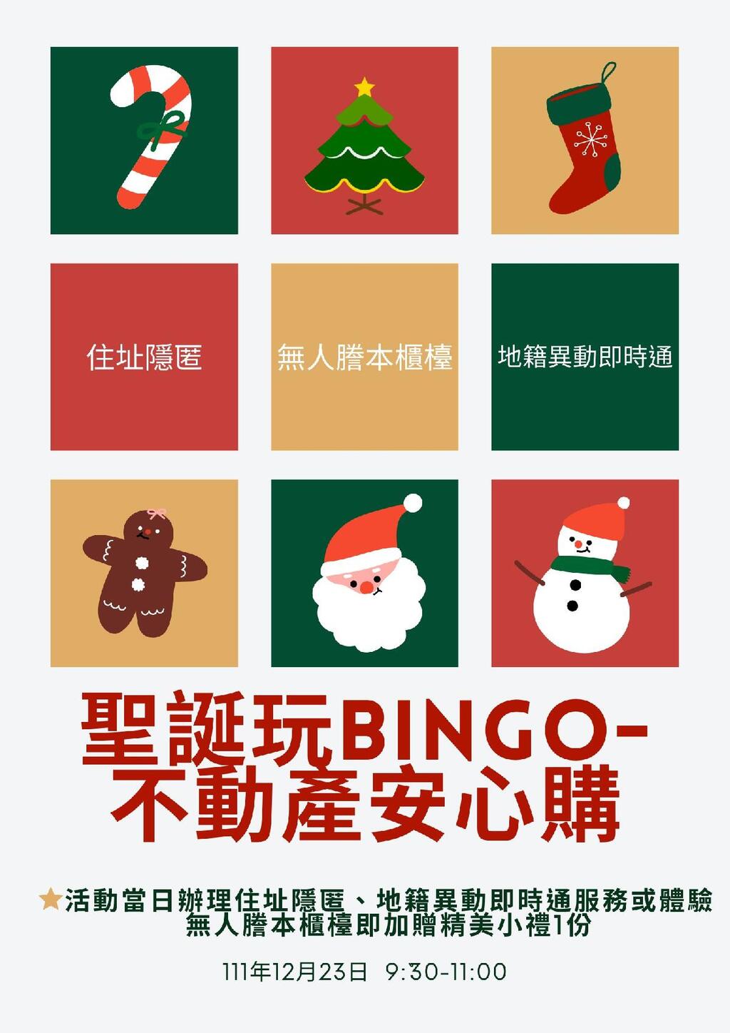 一年一度的聖誕節又到囉!除了盛大的新北歡樂耶誕城外,板橋地政事務所於12月23日(星期五)上午9時30分至11時,在該所一樓大廳舉辦「聖誕玩BINGO-不動產安心購」宣導活動,當日凡現場參與活動的民眾,皆可獲得不同的實用小禮1份,數量有限,送完為止!