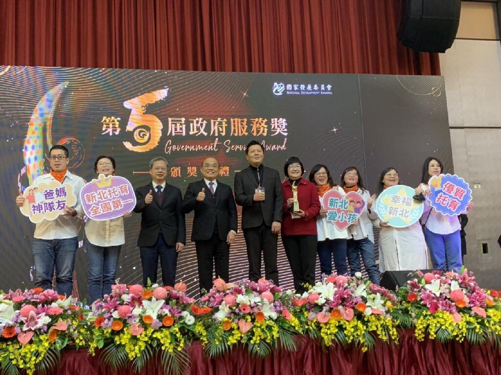 國家發展委員會今(19)日在臺大醫院國際會議中心201廳辦理第5屆「政府服務獎」頒獎典禮,新北市政府以「零碳社區-住新北好市、選新北好厝」及「公托破百,百家百佳」分別榮獲數位創新加值類及社會關懷服務類獎項,由行政院院長蘇貞昌親臨現場頒獎。新北市政府由朱副秘書長惕之率隊前往領獎,並感謝蘇貞昌院長肯定。