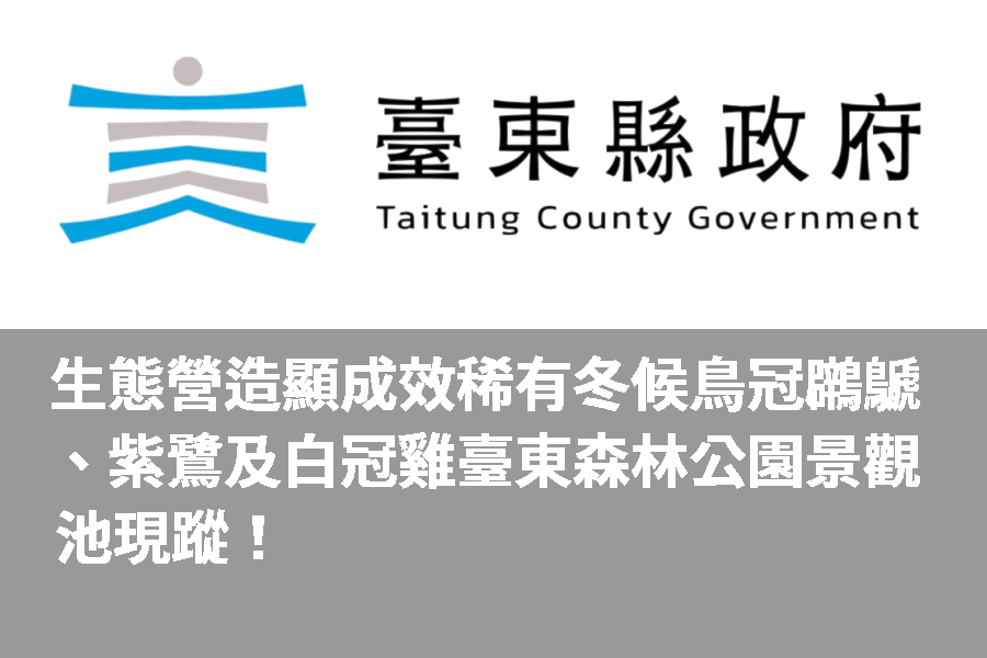臺東縣政府為打造生態親子學習場域、改善森林公園景觀等目的,推動臺東森林公園景觀改造工程,至今已進行16個月,進度已完成九成以上,預計在不久的將來,森林公園即將以嶄新風貌迎接大眾前來。近日生態檢核團隊於蓮花池紀錄到冠鸊鷈、紫鷺、白冠雞等罕見珍貴冬候鳥,已率先前來體驗環境,讓縣府及施工廠商相當驚喜及振奮,並期望喚起社會各界對生態保護的重視,推動臺東自然環境的永續發展。