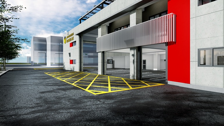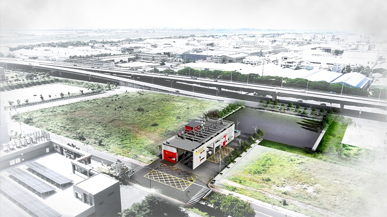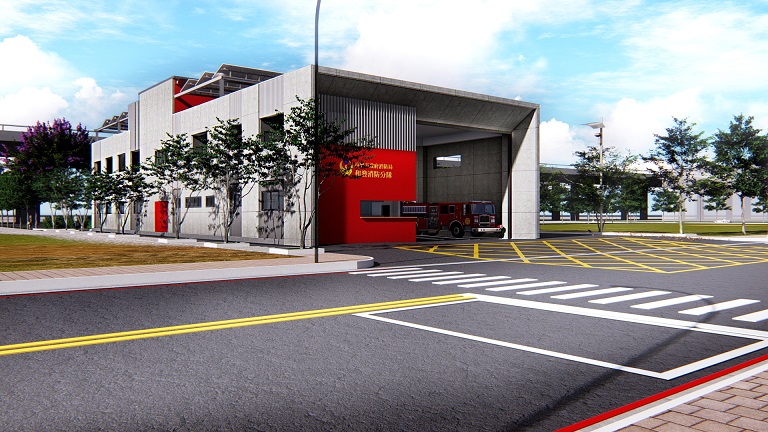 建築規劃配合和發產業園區細部計畫,以停車場用地多目標使用方式開發,整合用地整體開發及動線系統,退縮13M車道空間,預留後續立體多目標開發停車場需求。消防車輛出入口配置於北側道路及西側退縮車道旁,可同時出動六輛以上消防救護車輛,提升出勤救援效率。整體建築物以抽象量體層層堆疊方式,給予層次的空間概念,同時整合後期工程界面;並採用消防隊特有的色彩識別性,將紅黑白三種色彩元素,以輔色概念將主牆面、陽台內側牆面及格柵添色,藉由格柵透出空間層次氛圍,使空間活化、維持建築整體的簡潔乾淨,營造消防局獨特建築意象。