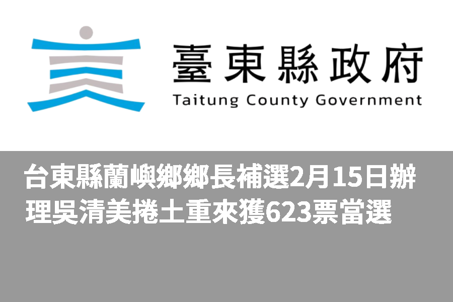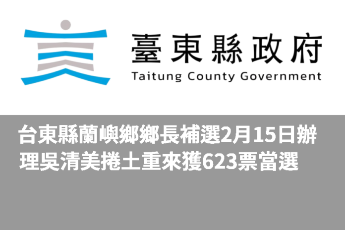 台東縣蘭嶼鄉長補選作業,於今(15)日在全鄉4個投票所辦理,共有4位候選人參與此次補選,選舉人數共計4283人,結果由上次鄉長選舉不幸落敗的吳清美,捲土重來再戰以623票,擊敗另外三位對手當選,總投票率為37.05%。