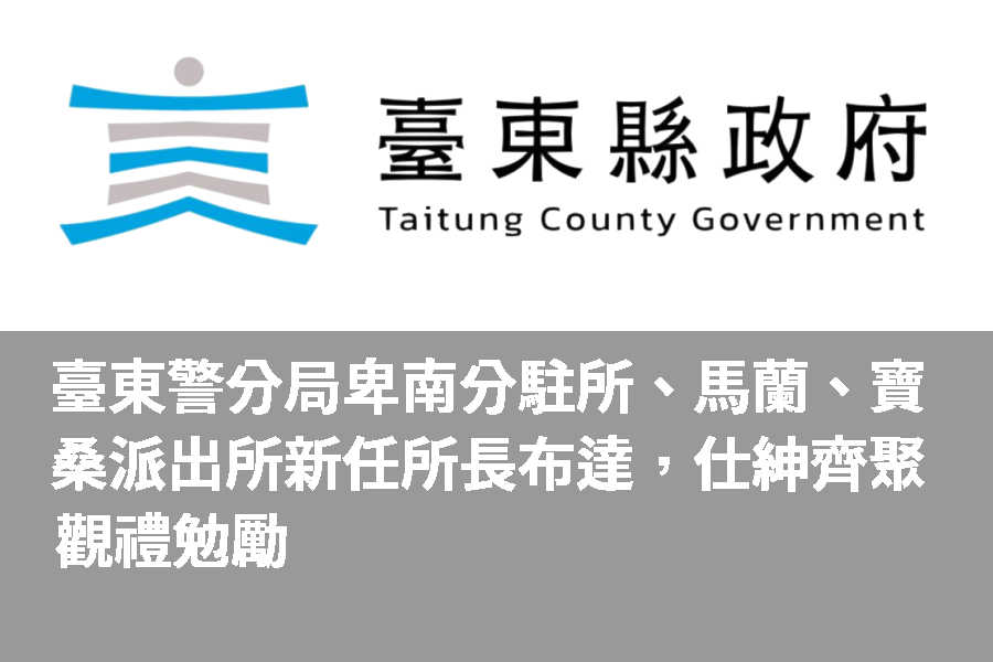 臺東縣警察局臺東分局於2月19日上午,舉行卑南分駐所、馬蘭、寶桑派出所新任所長布達典禮,黃建賓立委服務處主任張永通、縣議員楊招信、李建智、黃治維議員秘書成玠翔、卑南鄉長秘書謝英雄、臺東天后宮董事楊卿勇、新生國中校長王中興、警友辦事處主任翁浤銘、副總幹事邱東翔、組長廖益鋒、寶桑站長江木榮、轄區鄉民代表廖忠聖副主席、廖聰和、李俊賢、村(里)長、警友、義警、民防、志工幹部、學校及金融機構主管等仕紳鄉親均踴躍到場觀禮,給予新任所長最大祝福,期勉無縫接軌所務,維護轄區良好治安,並秉持「警民一家親」與地方良好互動。