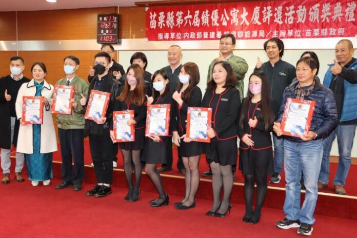 縣府12月21日上午在2樓會議室頒獎表揚入選的第6屆苗栗縣績優公寓大廈,縣長徐耀昌希望透過評選活動激勵居民主動參與社區經營管理,提升居住環境品質。