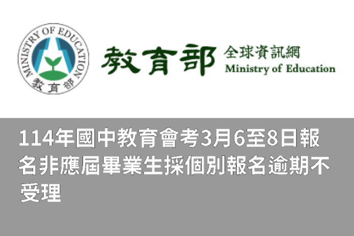 114年國中教育會考於3月6至8日辦理報名,4月11日寄發准考證,5月17、18日考試。教育部及全國試務會提醒所有考生,應於簡章規定報名時間內完成報名手續。非國民中學應屆畢業生採個別報名,須先自行上網填寫個別報名資料、列印個別報名表,並親至考區試務會繳交報名資料,逾期不受理。更多資訊可至國中教育會考網站(https://cap.rcpet.edu.tw)查詢,或洽所屬考區試務會。