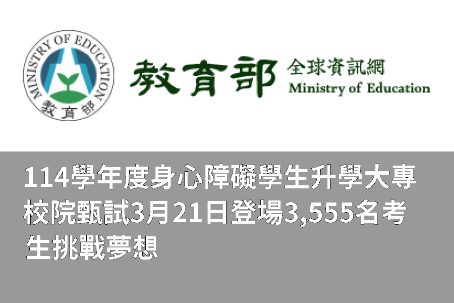 114學年度身心障礙學生升學大專校院甄試(以下簡稱本甄試)將於3月21日至24日舉行,今年共有3,555名考生報名。本次甄試中,依各障礙類別統計,考生人數分布如下:視覺障礙生69人、聽覺障礙生201人、腦性麻痺生76人、自閉症生985人、學習障礙生1,315人、肢體障礙生115人、其他障礙生794人。此外,今年加考美術術科考生共211人,音樂術科考生共9人,考生蓄勢待發,期待能在本甄試展現專業才能,爭取升學機會。