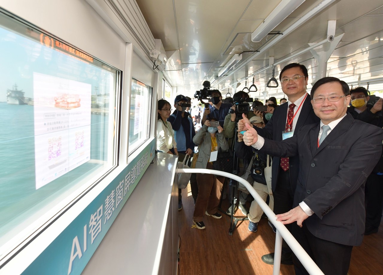 • 圖說一:經濟部與高輪公司今(22)發表全球首創的「AI智慧窗屏導覽系統」並啟用「鼓山-棧貳庫-旗津」遊港新航線,打造南臺灣第一艘智慧遊船