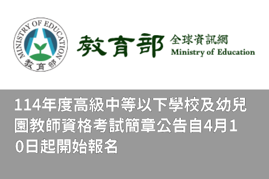 114年度高級中等以下學校及幼兒園教師資格考試(以下簡稱教師資格考試)訂於6月15日(星期日)舉行,考試簡章今(28)日公告於教師資格考試網站(https://tqa.rcpet.edu.tw),報考人請自行至網站免費下載。114年度教師資格考試報名自114年4月10日(星期四)上午8時30分起至4月17日(星期四)下午3時止,採網路報名,亦須於期限內完成繳費,逾期不予受理。