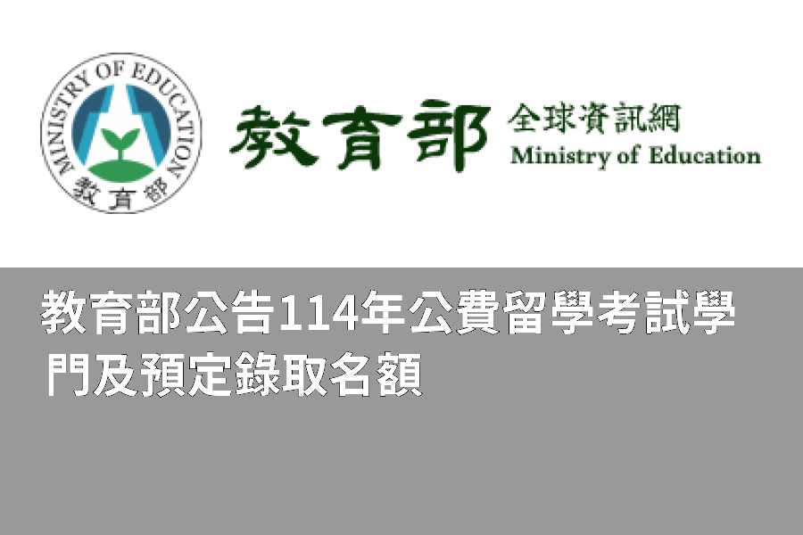 114年公費留學考試學門、研究領域、留學國家、應考專門科目及預訂錄取名額等已公告於教育部全球資訊網(https://www.edu.tw/),點選路徑為:教育部首頁―認證檢定及留考―公費留學與各項獎學金―公費留學考試,有意報考者請儘早準備。