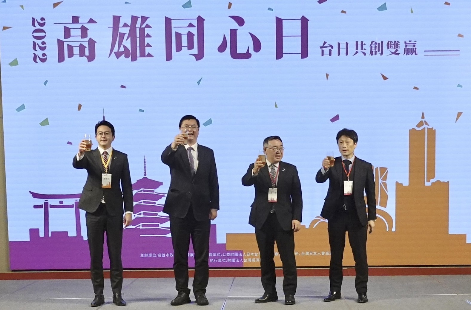 • 圖2:左起高雄市經發局局長廖泰翔、高雄市副市長羅達生、日台交流協會所長小野一彥、日本人會高雄支部長中川善夫同台大喊日文「乾杯」舉杯為活動暖場,感謝日商為高雄經濟發展所作貢獻及努力