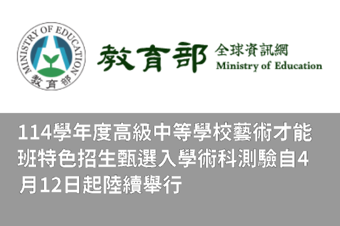 114學年度高級中等學校藝術才能班特色招生甄選入學術科測驗,將於4月中旬以分類、分區方式辦理,各類各區報名經於3月3日截止後,共計有3,225人報名,並已於3月14日寄發准考證,教育部提醒各考生務必備妥相關證明文件及用具應試,並詳閱公告規定事項。