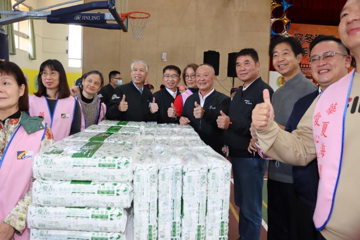 今天的寒冬送暖活動,除了基金會率先提供每戶1個紅包及白米外,頭份惠光獅子會、驊康科技公司、中石化頭份廠、華夏海灣塑膠公司愛心社、常州台商會執行長陳俊隆都提供了豐富的生活物資,讓到場的422戶弱勢家庭領取,特別是陳俊隆執行長,提供家戶特大好黃金鯧一條,希望這些家庭,在圍爐時能年年有餘,家運隆「鯧」,別具意義。