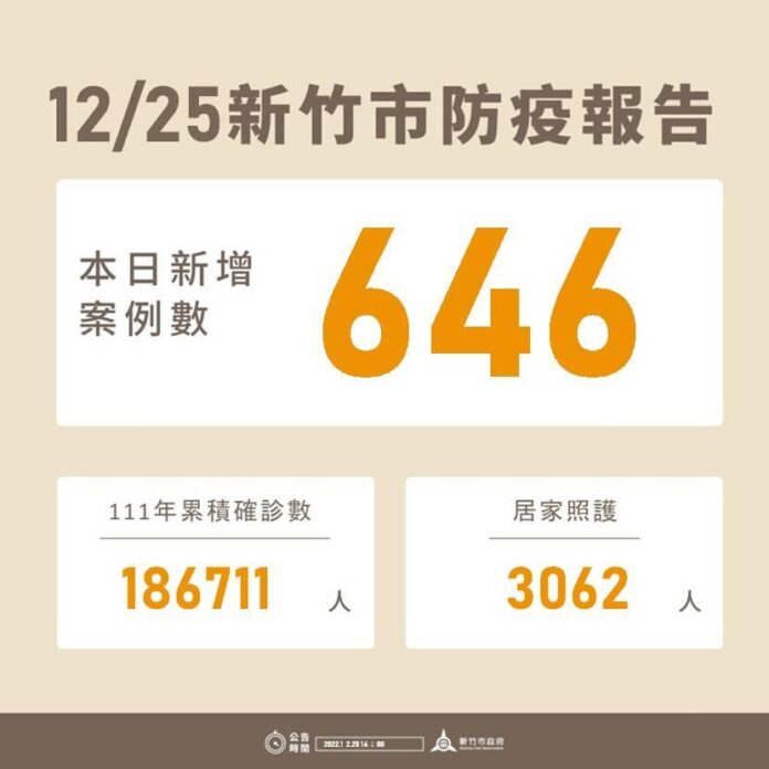 新竹市今(25)新增646例確診個案,今(111)年以來累積186,711例,居家照護者為3,062人。