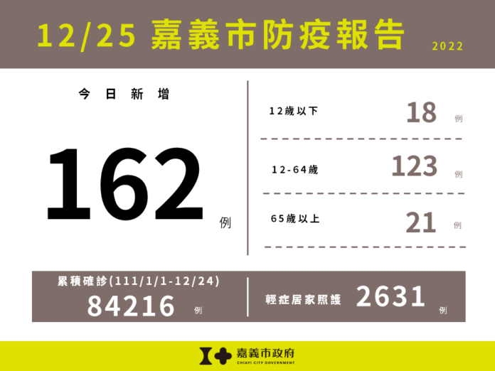 中央流行疫情指揮中心今(12/25)日公布嘉義市新增162例確診個案,包含12歲以下18例,12-64歲123例,65歲以上21例。嘉義市目前輕症居家照護人數2631人。111/1/1截至111/12/24嘉義市累計確診嚴重特殊傳染性肺炎本土病例數為84216人。 衛生局提醒,請大家儘速接種疫苗,並持續落實勤洗手、咳嗽禮節及佩戴口罩等防疫措施,避免出入人多擁擠的場所及高感染傳播風險場域,如出現疑似症狀,儘速快篩就醫和遵從醫囑及早服藥,降低重症及死亡風險;並請養成規律運動、均衡飲食、充足睡眠、壓力調適、不吸菸等健康習慣,提升免疫力,守護自己與家人的健康。