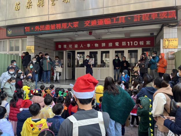 每位小朋友均非常用心裝扮,相當可愛,用純真的眼神及稚嫩的聲音對員警們說著感謝的話語,融化了所有在場員警們的心,氣溫雖然寒冷,但有了這些貴賓帶來滿滿祝福,讓員警們內心相當溫暖。竹南警分局為增強小朋友們自我保護能力,藉此難得時機,進行交通安全、防詐反毒、婦幼安全、反貪等預防犯罪宣導,並致贈小禮物,在場所有小朋友與家長們均專注聆聽,最後進行大合照,一起留下開心珍貴的紀念。