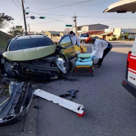 到達現場後,汽車車頭嚴重毀損,駕駛已自行脫困,僅剩副駕駛座一名患者女性60多歲意識清醒,於車內等待救援,由於患者頸圈經救護人員評估有壓痛,立即給予患者頸圈固定頸椎後,利用長背板固定患者後,將患者抬出車外上救護擔架,給予氧氣面罩,後送責任醫院處置。